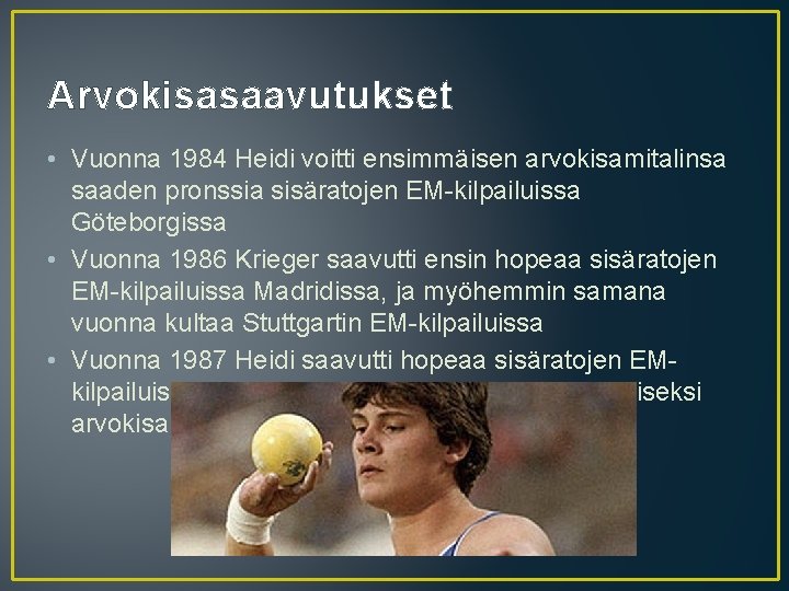 Yleistä tietoa ja uran alkuvaiheet • Heidi Krieger syntyi 20. 7. 1966 Itä-Berliinissä, ItäSaksassa • Hän oli kuulantyöntäjä Itä-Saksan urheilijoissa • Heinäkuussa 1979 Heidi sai kutsun arvostettuun urheilukouluun Berliiniin • Koulu oli yhteydessä suureen urheiluseuraan SC Dynamoon, jota sponsori Itä-Saksan salainen poliisi Stasi • Neljä kuukautta myöhemmin, 1979 vuoden lopulla, Heidi aloitti uuden koulunsa • Hänelle tehtiin aikataulu joka sisälsi kaksi harjoitus- ja kaksi opiskeluaikaa päivittäin
