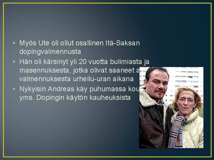 • Myös Ute oli ollut osallinen Itä-Saksan dopingvalmennusta • Hän oli kärsinyt yli 20 vuotta bulimiasta ja masennuksesta, jotka olivat saaneet alkunsa rankasta valmennuksesta urheilu-uran aikana • Nykyisin Andreas käy puhumassa kouluilla yms. Dopingin käytön kauheuksista