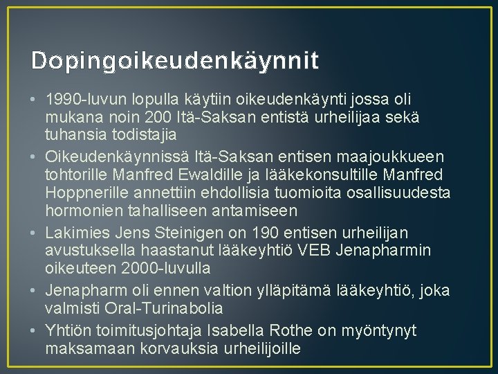 Dopingoikeudenkäynnit • 1990 -luvun lopulla käytiin oikeudenkäynti jossa oli mukana noin 200 Itä-Saksan entistä urheilijaa sekä tuhansia todistajia • Oikeudenkäynnissä Itä-Saksan entisen maajoukkueen tohtorille Manfred Ewaldille ja lääkekonsultille Manfred Hoppnerille annettiin ehdollisia tuomioita osallisuudesta hormonien tahalliseen antamiseen • Lakimies Jens Steinigen on 190 entisen urheilijan avustuksella haastanut lääkeyhtiö VEB Jenapharmin oikeuteen 2000 -luvulla • Jenapharm oli ennen valtion ylläpitämä lääkeyhtiö, joka valmisti Oral-Turinabolia • Yhtiön toimitusjohtaja Isabella Rothe on myöntynyt maksamaan korvauksia urheilijoille