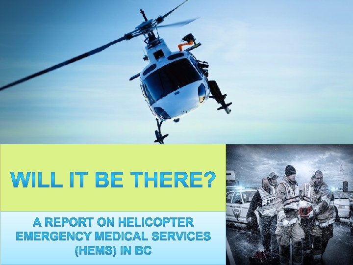 Helicopter Emergency Medical Services (HEMS) • HEMS is an air ambulance service • In BC HEMS is provided by the BC Ambulance Service (BCAS) – the sole provider of ambulance services in BC, mandated under the Emergency Health Services Act • In BC HEMS is used mainly to transport critically ill people between medical facilities • It also responds to incidents where air transport versus ground, is needed.