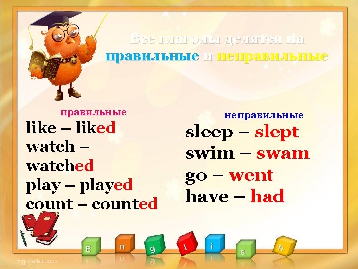 Compare: Present Simple I go to school every �I went to school �� I go to school every day yesterday. �Boys play football. �Girls played volleyball. �Boys play football. �Grandma watches TV � Mom watched a film. in the living room. � Grandma watches TV �in the living room. It is cold today �It was cold yesterday
