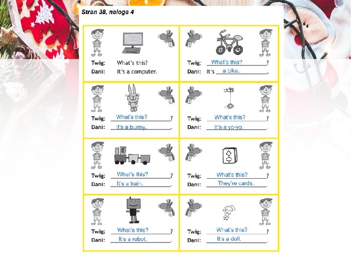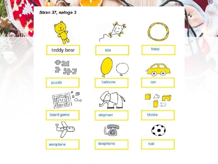 BOOK – P. 42 NOTEBOOK CHECK YOUR ANSWERS. Preveri rešitve. TOYS (igrače) A KITE – (papirnati) zmaj √ A CAR – avtomobilček √ A PUZZLE – sestavljanka √ A DOLL – punčka √ CARDS – karte √ A COMPUTER – računalnik A HOOP – obroč A BOAT – čolniček A BIKE – kolo √ A BALLOON – balon √ YO-YO – jojo A PC GAME – računalniška igra √ A TEDDY BEAR – plišasti medvedek √ A TRAIN – vlakec √ BLOCKS – kocke √ A BOARD GAME – družabna igra √ AN ELEPHANT – slonček √ A BALL – žoga √ A ROBOT – robot √ A BUNNY – zajček A CELL PHONE – prenosni telefon AN AEROPLANE – avionček AN UMBRELLA – dežnik