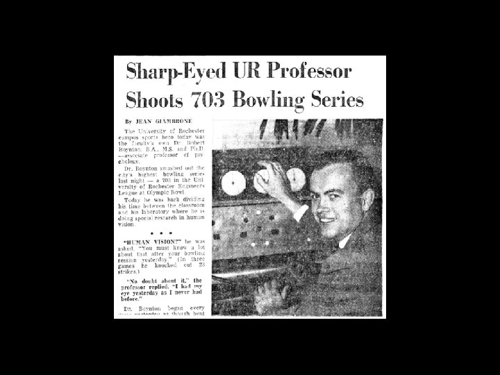 I don't recall if it was the first time I met him, but I met him memorably at Psychonomics in San Diego, years ago. That year, well before I got into the attention trade, he was doing illusory conjunctions. His planned demo involved a whole carousel of slides in those pre-ppt days. When the slide projector jammed, he could only watch from the front as a collection of well-meaning guys tried to fix things. As he said "Don't turn that carousel over", someone did and 80 slides hit the floor. Ah well, it was still good science. - Jeremy Wolfe I want to convey my deep admiration for your father, and my affection, and perhaps above all my gratitude for all I've learned from him over many years. His masterful tutorial chapter in Sidowski's 1966 Experimental Methods and Instrumentation in Psychology was my introduction to physiological optics 40 years ago--my grimy old copy is covered with notes, testifying to the many hours I spent with it. And of course Human Color Vision has taught most of us whatever we know about that uniquely wonderful field, where psychology makes contact with the deepest currents of human thought. –Jack Yellot