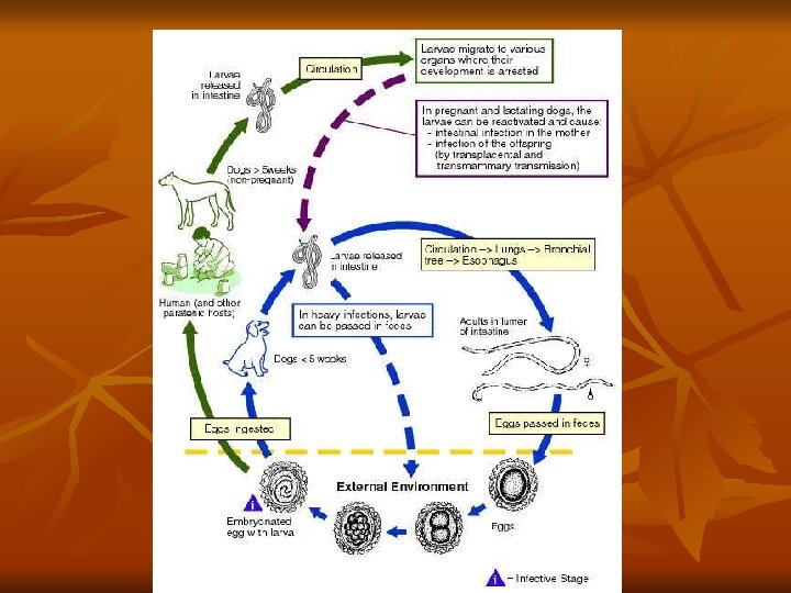 In prey-predator relationship paratenic host acquire the larval stage after it has developed to infection stage in soil or intermediate host and provide for: Ø protection and the Ø Availability to its final host. v The example of paratenesic was coined seen in the enzootic cycle of toxocara canis a cause of visceral larva migrant v