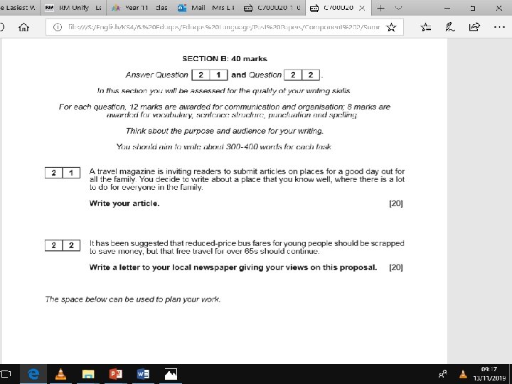 Component 1, Section B: Creative Writing Sample Questions (45 mins) Choose one of the following titles for your writing: [40 marks] a) Continue the following: It really wasn’t the result I was looking for. b) Grandma. c) Write about a time when you had to go shopping with a relative. d) Write a story which ends: ‘…and I felt so sorry for myself’ 5 mins: Plan 35 mins: Write 5 mins: Check