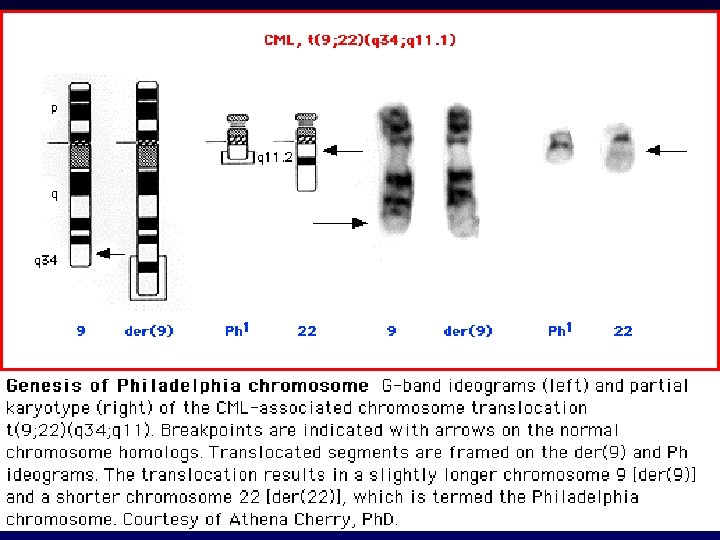 Philadelphia chromosome • Chromosome 22 often referred as Ph (95% of pts with CML) • Reciprocal translocation t(9; 22) – piece of chromosome 9 (c-abl) translocate to chromosome 22 (bcr) [BCR-ABL] and piece of 22 to 9 [ABL-BCR]. • BCR-ABL - constitutively active tyrosin-kinase • target for therapy (STI 571) – prognostic value – therapy response - Minimal Residual Disease