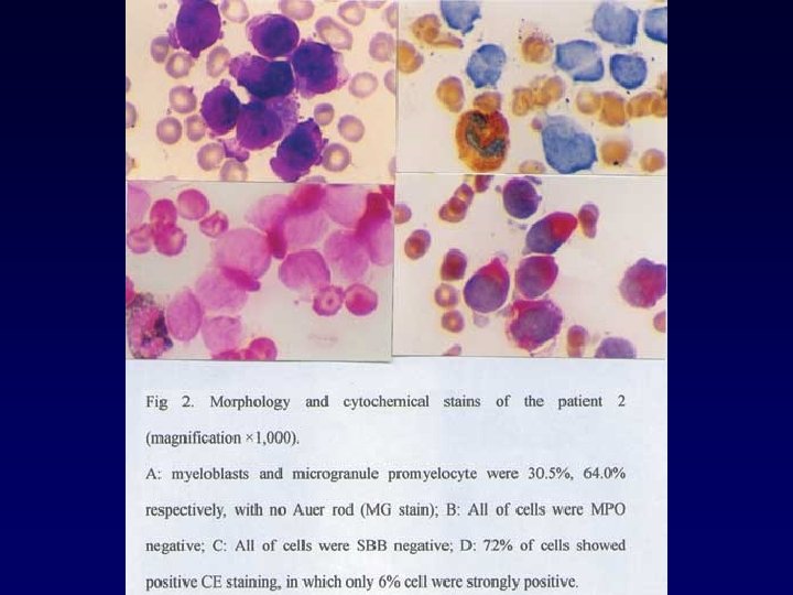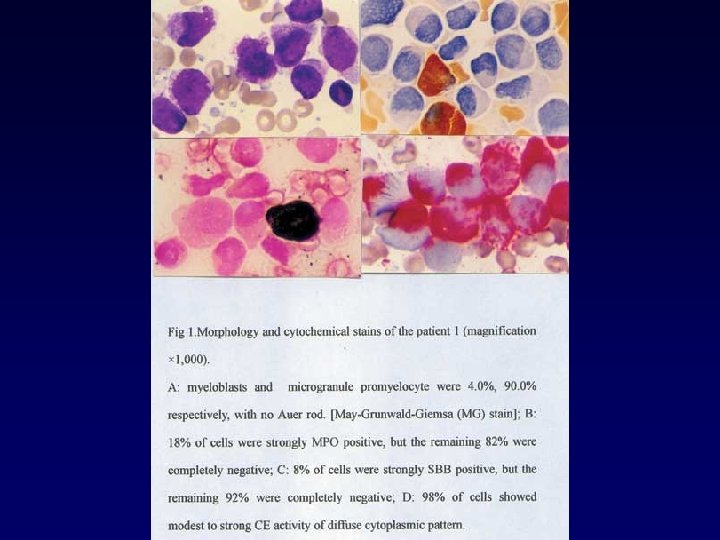 Histochemical analysis of enzymatic activity in BM blasts • ALP – high in normal blasts / low in leukemia blasts • Peroxidase activity – leukemic blasts • Nonspecific esterase – monocytes (leuk. phenotype)