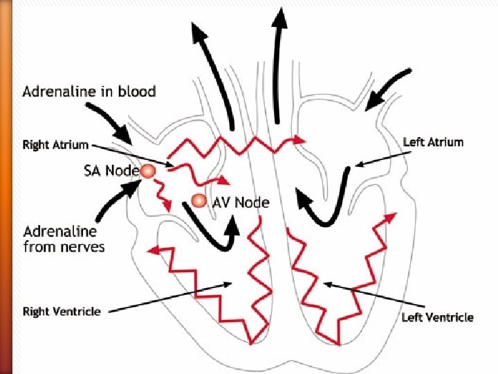 ELECTRICAL CONTROL OF HEART CONTRACTIONS 1. SA (sino atrial) NODE = PACEMAKER » Located in right atrium » SA node sends out electrical impulse » Impulse spreads over atria, making them contract » Travels to AV Node 2. AV (atrio ventricular) NODE » Conducting cell group between atria and ventricle » Carries impulse to bundle of His