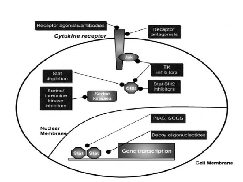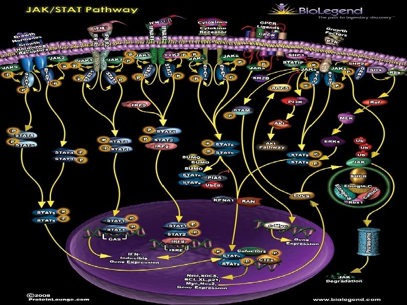 Reseptör Dimerizasyonu STAT- Bağlanması Hücre membranı Tirozin kinaz Tirozin fosforilasyonu STAT- Sitoplazma Çekirdek Dimerizasyonu DNA’ ya Bağlanma Transkripsiyon Sitokin Responsif Promotor Eleman