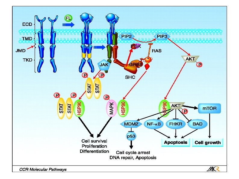 FLT 3 • FLT 3 R’lerin kontrolsüz ve daimi aktivasyonunun akut myeloid lösemiye yol açtığı bildirilmiştir • AML’lerin %30’undan fazlasında tanımlanmıştır • Juxtamembran domain’in ITD AML ve MDS de tanımlanmıştır • Yüksek lökosit ve blast sayısı ile korele bulunmuştur ve kötü prognoz?