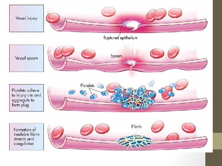 Hemostasis • Platelet plug formation • Collagen fibers are exposed • Platelets become “sticky” and cling to fibers