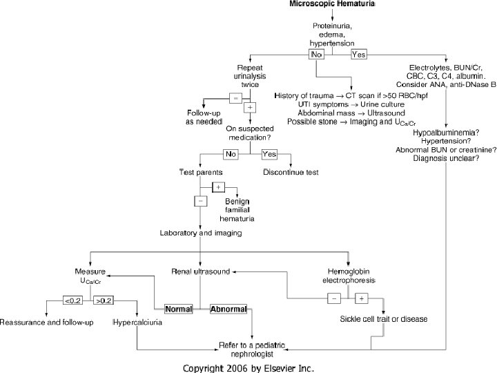 Hematüri izlem protokolü Hematolojik tetkik İdrar Tbc tetkik mikroskopi lokosit Eritrosit Silendirleri Dismorfik eritrositler Proteinüri araştırılması Anlamlı Anlamsız proteinüri Bb fonk ölç Renal Tbc Bb bx US+ ADBG hiperkalsiüri Normal Renal Parankimal hast Hematolojik defekt İdrar Ca/Cr İzole hematüri İVP Obstrüksiyon Taş tümör Hematüriyi izle Proteinüriyi izle Aile üyelerini muayene Erkekte odyogram 6 aydan uzun Persistan hem Anormal Aralıklı hem sistoskopi iyileşme