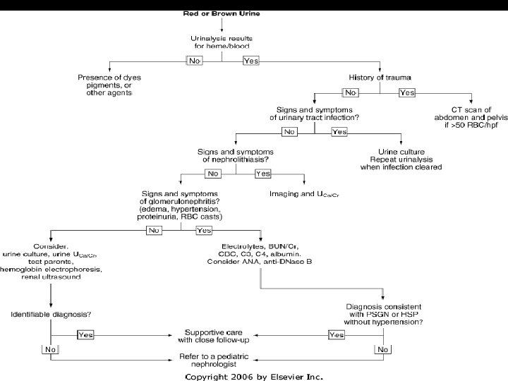 İzole hematüri • İdrar eritrosit morfolojisi -Kültür, Tbc tetkik -Ca/Kreatinin • Serum biyokimya • Orak hüc nemi araştırması • Bb USG Dismorfik eritrosit Normal eritrosit • 24 saatlik idrar protein, Cr • C 3, C 4, ASO, ANA, Anti-DNA • 1. akrabaların tetkiki Düşük kompleman • Akut. GN • Lupus nefriti • Memb prol. GN • Şant nefriti • Subakut bak. endokar Anormal USG Normal kompleman + aile öyküsü Alport send Bening familyal hematüri - Aile öyküsü Ig. A nef FSGS • İYE • Taş • Travma • Kistik hast • Hidronefroz • Tm Normal USG • Üriner sistem İnfeksiyonu Hiperkalsiüri • Travma • İlaçlar • Kanama diyatezi • Hemoglobinopati
