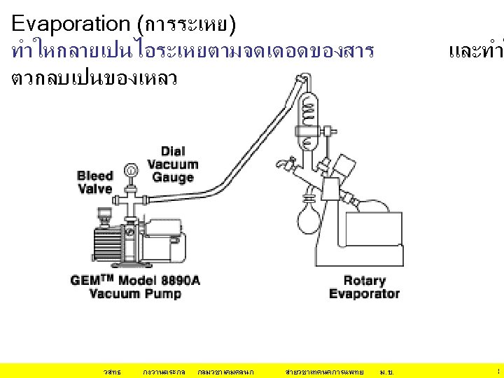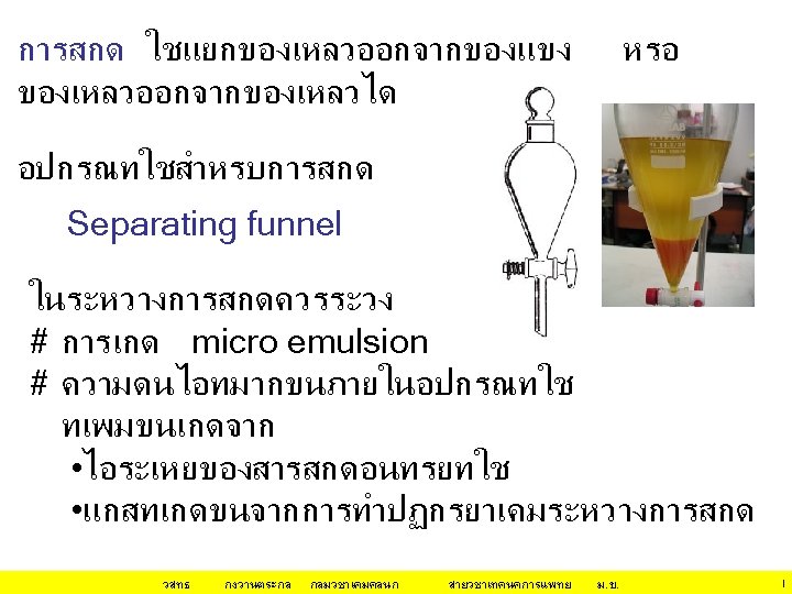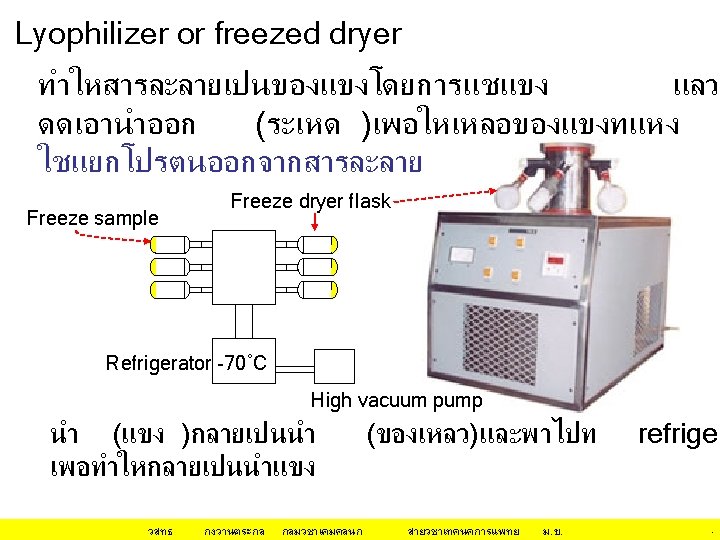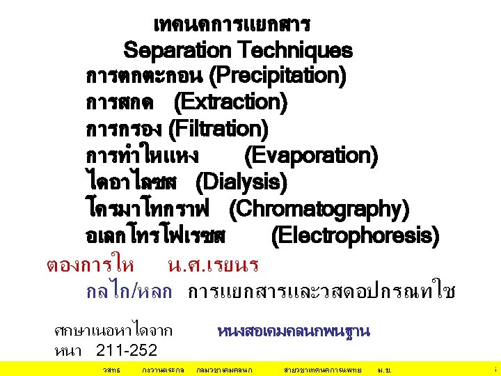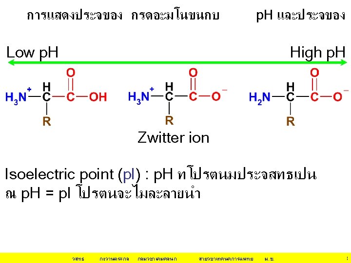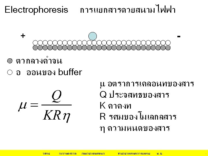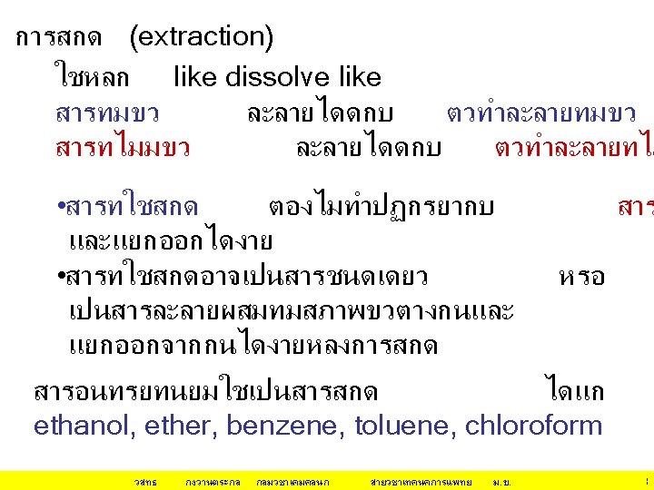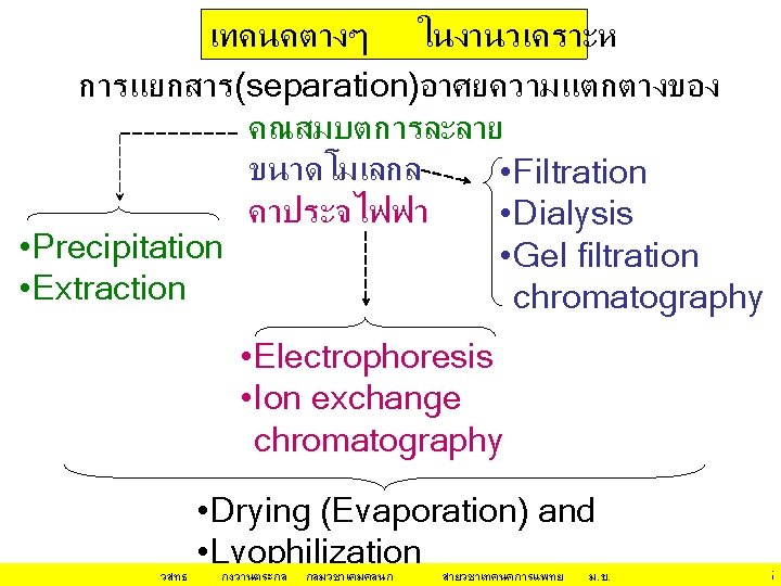 กลไก/หลกการทำให โปรตน ตกตะกอน(ไมละลายนำ • Isoeletric Precipitation changing the p. H of the protein solution • Use of an Organic Solvent for Precipitation นำ (H 2 O) ชอบจบกบ hydrophilic surfaces ของโป Organic solvent ชอบจบกบ hydrophobic surfaces ของโปรตน Organic solvent ทำให ลดลง วสทธ กงวานตระกล dielectric constant of the medium กลมวชาเคมคลนก สายวชาเทคนคการแพทย ม. ข. 12