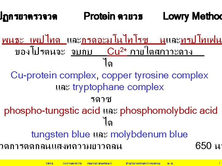 กลไก/หลกการทำให โปรตน ตกตะกอน(ไมละลายนำ • Addition of a non-ionic polymer or metal ions dextrans and polyethylene glycols reduce the amount of water available to interact with the protein Mn 2+, Fe 2+, Co 2+, Ni 2+, Zn 2+, and Cd 2+ will bind strongly to carboxylic acids and to nitrogenous compounds Ca 2+, Ba 2+, Mg 2+, and Pb 2 will mainly bind to carboxylic acids Ag+, Hg 2+, and Pb 2+ will bind strongly to sulhydryl groups วสทธ กงวานตระกล กลมวชาเคมคลนก สายวชาเทคนคการแพทย ม. ข. 15