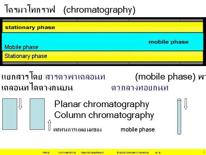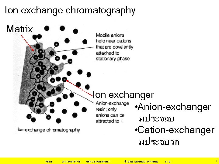 ชนด โครมาโทกราฟ Mobile Stationary phase Liquid Gas Liquid Solid Liquid • • • จำแนกตาม phase ทใช Liquid chromatography (LSC) Gas Liquid chromatography (GLC) Liquid liquid chromatography (LLC) จำแนกตามกลไกการแยก Adsorption chromatography Partition chromatography Ion exchange chromatography Gel filtration chromatography Affinity chromatography วสทธ กงวานตระกล กลมวชาเคมคลนก สายวชาเทคนคการแพทย ม. ข. 30