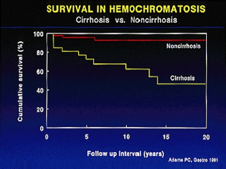 Résultats des saignées Ü A 30 ans amélioration de l’espérance de vie Ü Effets spectaculaire sur l’asthénie, la mélanodermie, les symptômes cardiaques, l’hyper-transaminasémie Ü A 50 -60 ans moins d’effets sur le diabète, les douleurs articulaires, l’insuffisance sexuelle, la cirrhose