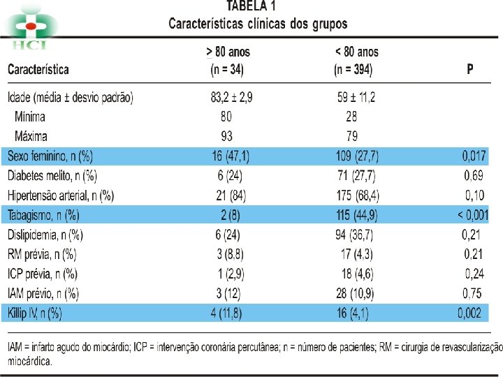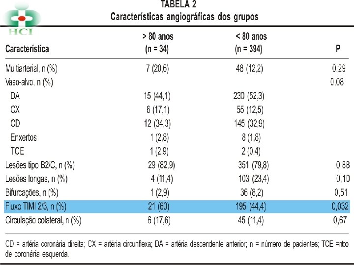 DISCUSSÃO NÃO OCORRERAM QUANTO A RESENÇA DE RMs OU ATCs PRÉVIAS BEM COMO EXTENSÃO E COMPLEXIDADE DAS LESÕES COMO EM OUTROS ESTUDOS PROPORÇÃO DE MULHERES E TAXA DE FLUXO CORONÁRIO TIMI 2/3 PRÉ INTERVENÇÃO NÃO FOI REALIZADA ANÁLISE DA FUNÇÃO DO VE => GRANDE PARTE DE AMBOS OS GRUPOS NÃO REALIZOU VENTRICULOGRAFIA GRUPO > 80 ANOS APRESENTOU KILLIP DE CLASSE MAIS AVANÇADA (IV) EVOLUINDO A MAIORIA A ÓBITO EM CHOQUE CARDIOGÊNICO