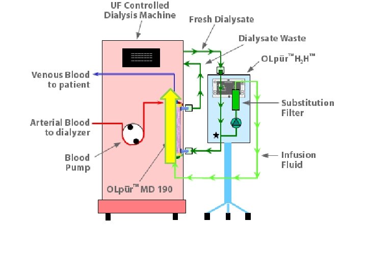 the substitution volume HF • postdilution= Kt/v*55% body weight • predilution= 2*Kt/v*55% body weight Kt/v=1 BW=60 KG Pre=60 cc/min Post=30 cc/min