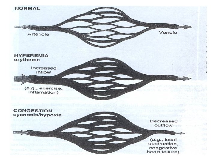 - Means local increase in volume of blood in a particular tissue. a. Active Hyperemia (arterial): is an active process resulting from increased arterial blood inflow because of arteriolar dilatation. - The affected tissue is reddened because of engorgement of tissues with oxygenated blood. b. Passive hyperemia (Congestion) is a passive process resulting from impaired venous outflow from a tissue. - The affected tissue has a red-blue color due to accumulation of deoxygenated blood.