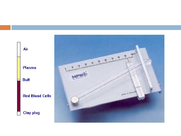 Procedure Place the filled and sealed capillary tubes into the centrifuge. The sealed ends should point toward the outside of the centrifuge. Centrifuge at (11000 rpm) for 5 min Read Hct in % by using microhematocrit reader NR : F 37 - 47% M 41 – 51% new born 53%- 65%