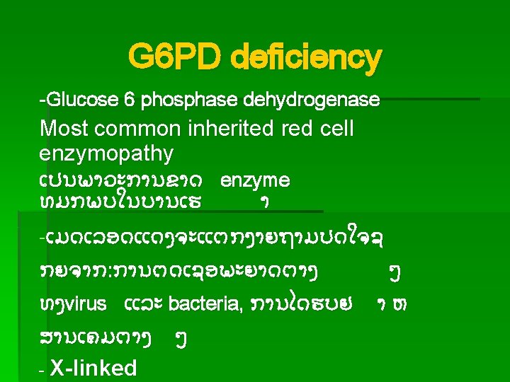 G 6 PD deficiency § Laboratory diagnosis § bite cells § Heinz bodies § measure G 6 PD level § Treatment § supportive § avoid precipitants § counsel patient/family