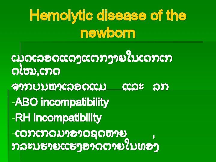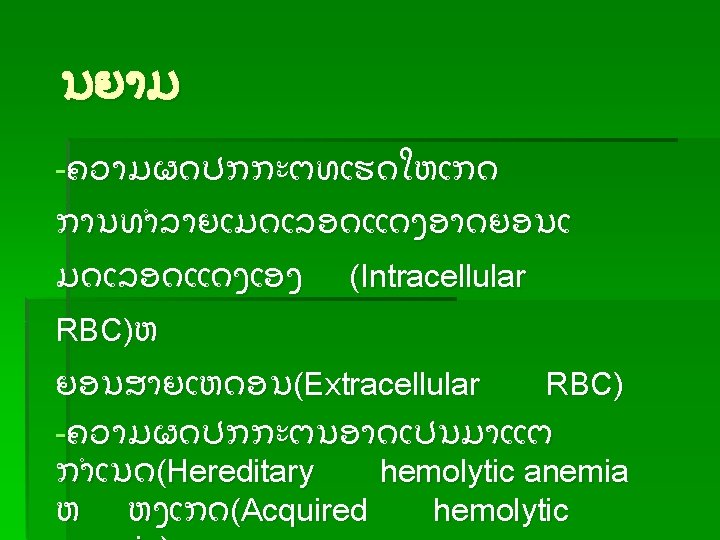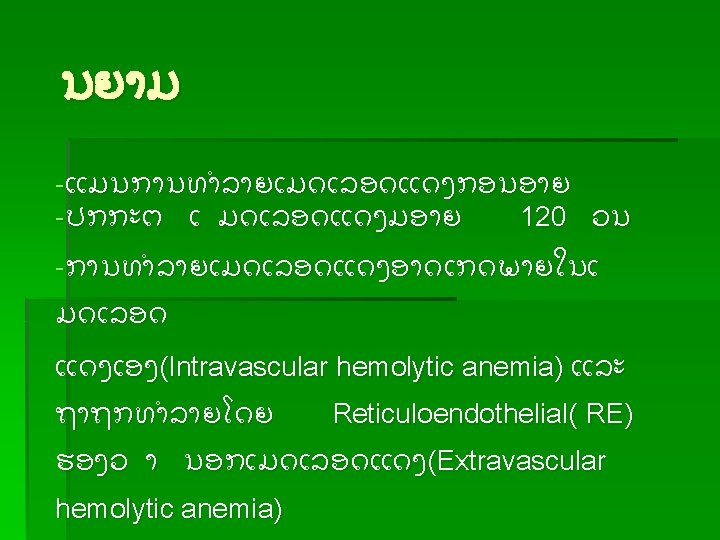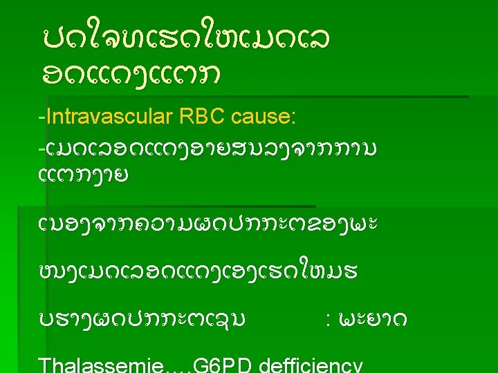 Hemolytic Anemia ເລອດຈາງຈາກການແຕກຂອງເ ມດ ເລອດແດງ Dr. Sommanikhone PHANGMANIXAY Pediatrician General Pediatrics