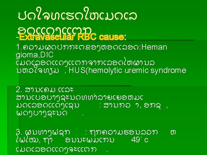 ປດໃຈທເຮດໃຫເມດເລ ອດແດງແຕກ -Extravascular RBC cause: 6. ປະຕກລຍາທາງ Immune ເຊນ : isoimmunenization, autoimmune hemolytic anemia(AIHA) Systemic lupus erythematous (SLE), Rhumatoid arthritis, Wiskott-Aldrich syndrome, or Ulcerative colitis. 7. Medications: Penicilline, antimalaria medications, sulfa medications, or acetaminophen