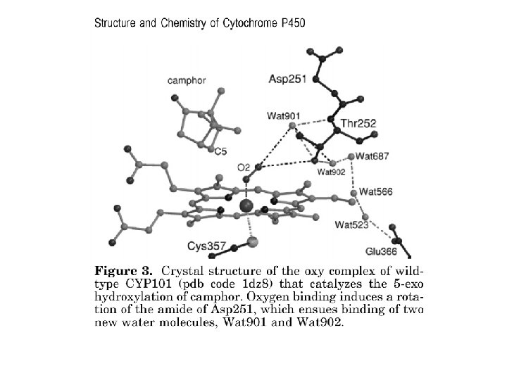 Catalytic cycle of cytochrome P 450 cam Substrate RH binds into the hydrophobic pocket and pushes H 2 O out from coordination site E ~ -0. 17 V Low-spin Fe. III Em≤ -0. 3 V e- from putidaredoxin Redox parnter of P 450 cam: putidaredoxin (Fe-S protein) Em≈ -0. 2 V O 2 binds to the empty coordination site e- from putidaredoxin http: //www. cup. uni-muenchen. de/ac/kluefers/homepage/L_bac. html