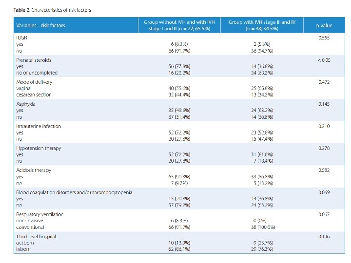 O objetivo do estudo foi examinar a influência dos os seguintes fatores (continuação) - Terapia nos primeiros 7 dias de vida com cristalóides (10 -15 m. L/Kg em bolus e/ou catecolaminas para o tratamento da hipotensão arterial (definida como pressão arterial média abaixo do valor correspondente à idade gestacional) § Tratamento da acidose com bicarbonato de sódio (quando o p. H sanguíneo estava abaixo de 7, 2 e / ou o <– 10 mmo. L / l) § Distúrbios de coagulação (definido como tempo prolongado de protrombina (PT) abaixo de 65% e / ou aumento da International Normal Ratio (INR) acima de 1, 5 e / ou prolongado tempo de tromboplastina parcial ativada (APTT) mais de 45 s de acordo com os valores de referência para o laboratório local) § Trombocitopenia (abaixo de 100. 000 plaquetas/mm 3) § Tipo de suporte ventilatório (invasivo versos não invasivo)