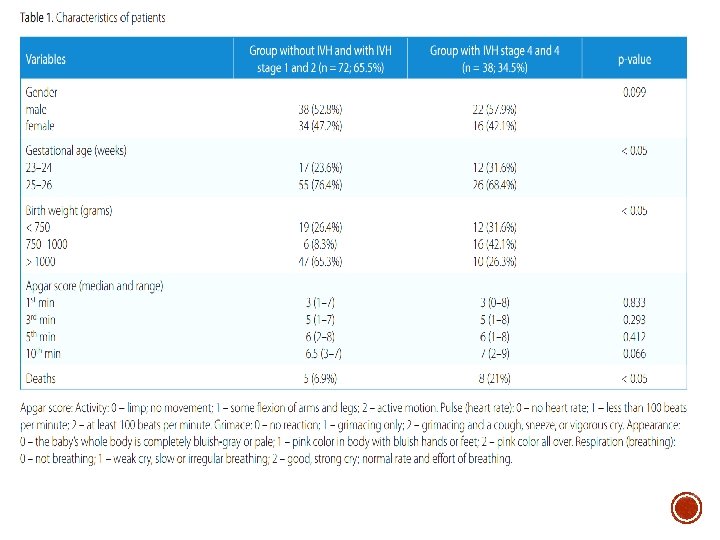 POPULAÇÃO DO ESTUDO §Foram analisados 110 recém-nascidos (RN) entre 23 e 26 semanas, admitidos na UTI Neonatal (S, entre os anos de 2009 -2014. §no grupo de estudo havia 29 (26, 4%) RN entre a 23ª - 24ª semana (GRUPO A) e 81 RN (73, 6%) entre 25ª -26ª semana (GRUPO B). As características dos pacientes estão na Tabela 1 Os recém-nascidos de gravidezes múltiplas, gravidezes nas quais um dos fetos morreu, lactentes com aberrações cromossômicas e infecção por TORCH não foram levados em consideração. § A limitação do estudo é a Análise Retrospectiva