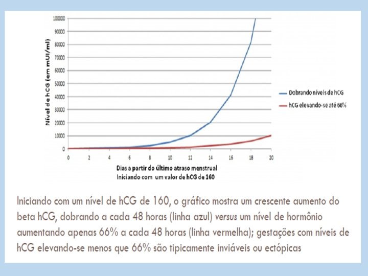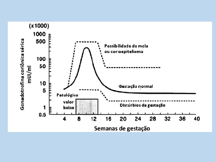 Utilidade das dosagens de h. CG • Diagnóstico precoce de gravidez 4ª. Sem = 1. 000 mili. UI/ml / 5ª. Sem = 3. 000 mili. UI/ml / 6ª. Sem = 6. 000 mili. UI/ml / 7ª. sem = 20. 000 mili. UI/ml (valores crescentes até 10ª. -12ª. sem) • Diagnóstico da prenhez ectópica ausência de ovo no útero com h. CG que não ultrapassa 6. 000 e 6. 500 mili. UI/ml • Diagnóstico de morte ovular valores baixos (5. 000 mili. UI/ml) ou valores decrescentes no acompanhamento seriado • Propedêutica hormonal dos coriomas produção de HCG tem proporção direta com a massa do tumor, refletindo sobre o curso clínico da doença e a terapêutica (cirúrgica e/ou quimioterápica) – dosagem supera 400. 000 mili. UI/ml • Prognóstico da ameaça de abortamento presença de ovo no útero com h. CG que não ultrapassa 6. 000 mili. UI/ml