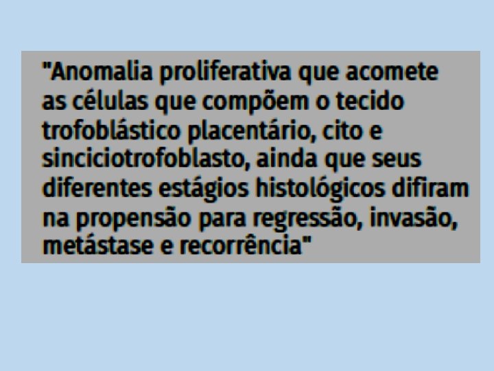 3 – Coriocarcinoma desarranjo do sinciciotrofoblasto e do citotrofoblasto 4% dos casos com metástases em outros órgãos – pulmão, vagina, pelve, fígado, cérebro