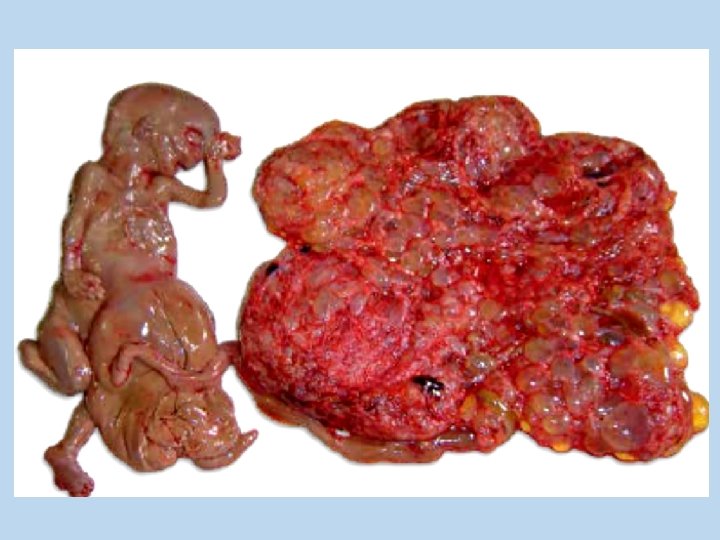 2 - Mola hidatiforme parcial um óvulo fecundado por dois espermatozóides que em: - 99% das vezes resulta em abortamento - 1% em mola parcial embrião ou feto inviável (numerosas malformações), vilosidades normais e focos de degeneração (áreas císticas) com necrose e hemorragia