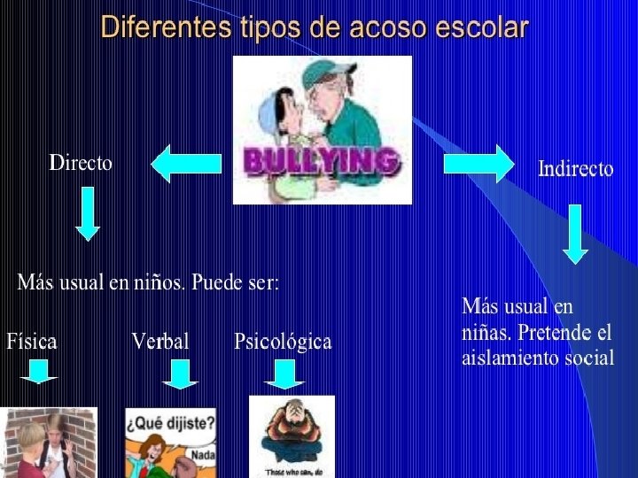CARACTERÍSTICAS DEL BULLYING -- El bullying puede tener como autores tanto a individuos como a grupos. -- Se caracteriza por un proceder sistemático y estratégico. -- Suele extenderse por un periodo más o menos prolongado. -- El bullying es un proceso de represión de problemas. -- Sus victimas se sienten en desventaja y se consideran las culpables de la situación. -- Puede tener forma directa como indirecta (agresiones físicas o psiquicas o de intriga).