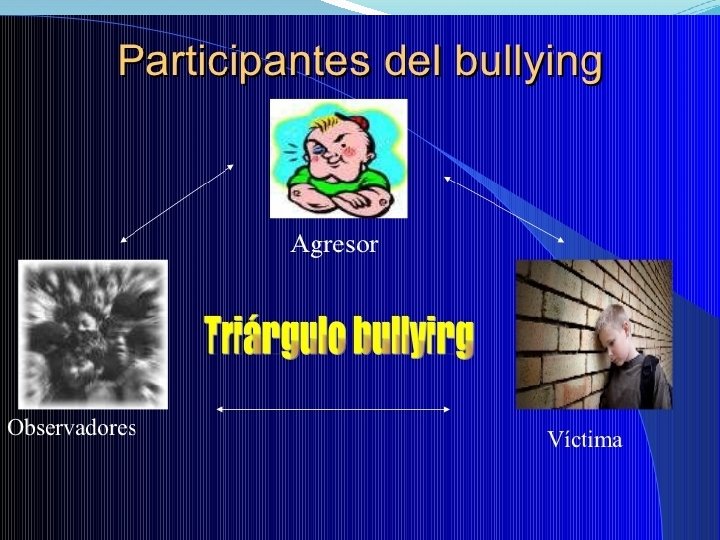 Tipologia del agresor Activo: Que agrede personalmente a la víctima Social – indirecto : Logra dirigir, a veces en la sombra, el comportamiento de sus seguidores a los que induce a actos violentos. Agresores Pasivos : Seguidores o secuaces del agresor