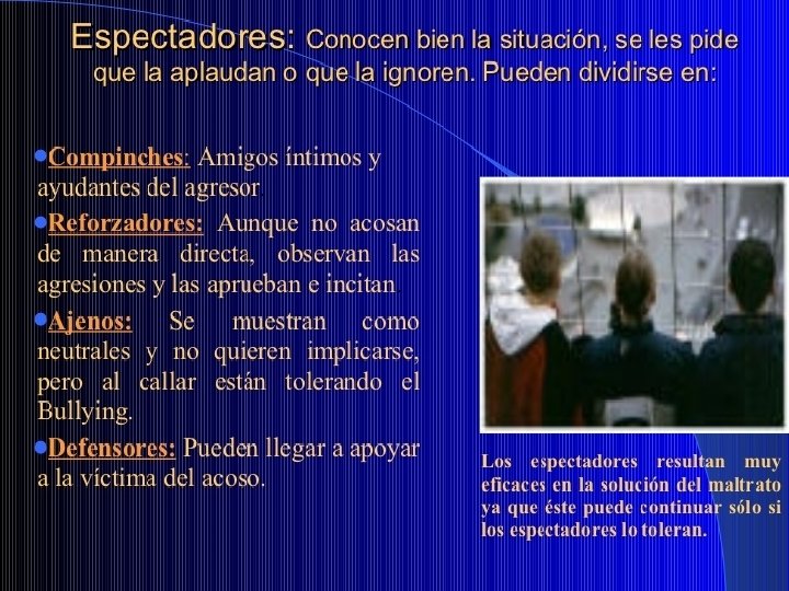 Los Espectadores deben mostrar una actitud de apertura, comunicación e interés por la victima. No posicionarse en el lado del acosador, y hacer que la víctima se lo cuente a los padres o personas cercanas, incluso a ir con él si no esta seguro. Han de ser conscientes de la importancia de mantener relaciones interpersonales cordiales, positivas y mutuamente satisfactorias entre iguales.
