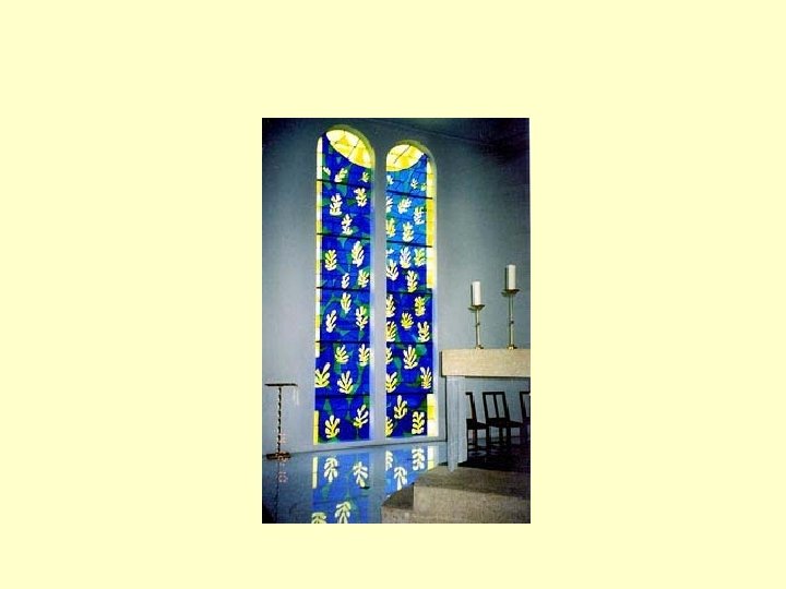 Chapel of the Rosary in Vence 1948 -1951 • Matisse crowning achievement was working in the Chapel of the Rosary. • He did the wall decorations, Stations of the Cross, designed the furniture, made the stain-glass windows and many other items in this Chapel.