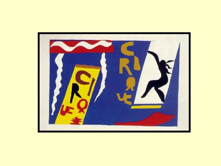 § He cut bright colored painted paper into shapes and juxtaposed them into formed images. § He continually had his assistants move pieces around until he felt they looked right. § He created huge pieces this way and his walls at home were covered in these cut-out collages.