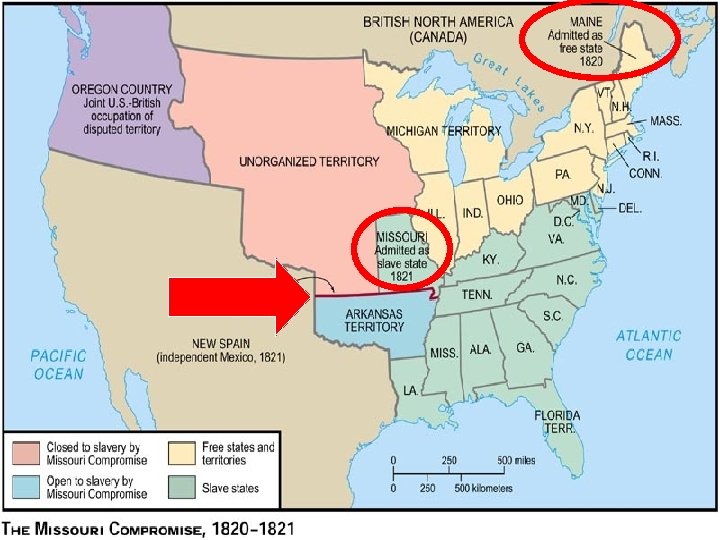 Missouri Compromise of 1820 Under Clay’s plan Missouri would be allowed to join the Union as a slave state. n Maine would join as a free state. n This would keep the balance between free and slave states. n An imaginary line would divide the lands of the Louisiana Purchase. n North of the line would be free states and south of the line would be slave states. n
