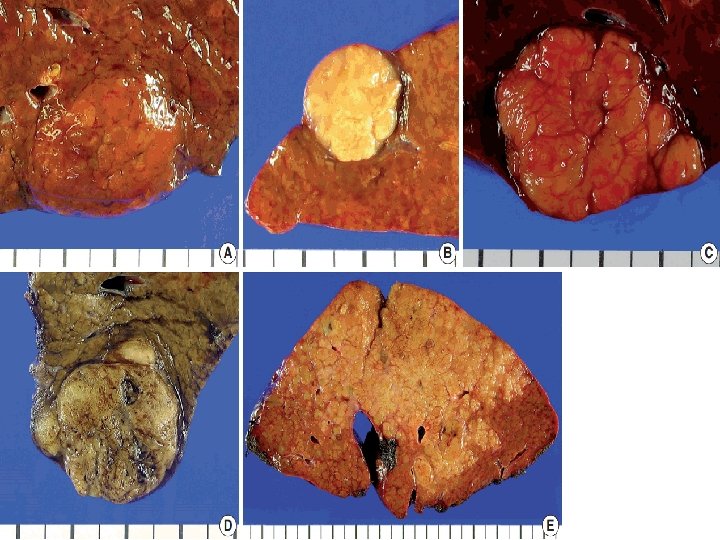 Morphology: Gross: (1) Unifocal massive tumor. (2) Multifocal tumor nodules of variable size. (3) Diffusely infiltrative cancer involving the entire liver, blending into the cirrhotic background. Tumor masses: v. Yellow white. v. Or bile staining & hemorrhage or necrosis. v. Soft in consistency because of little C. T. stroma in most hepatocellular carcinomas.