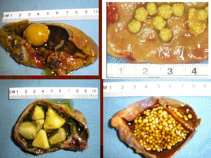 1. Cholesterol stones: Morphology: v. Arise exclusively in gallbladder. v. Consist of 50 -100% cholesterol Pale yellow. v. Increasing proportions of calcium carbonate, phosphates & bilirubin Gray-white to black. v. Ovoid & firm. v. Occur singly, but most often are numerous. v. Most cholesterol stones are radiolucent in X-ray. v 20% have sufficient calcium carbonate to appear radiopaque. v. Gallbladder mucosa: Redness due to acute & chronic cholecystitis.