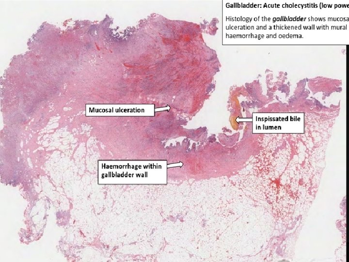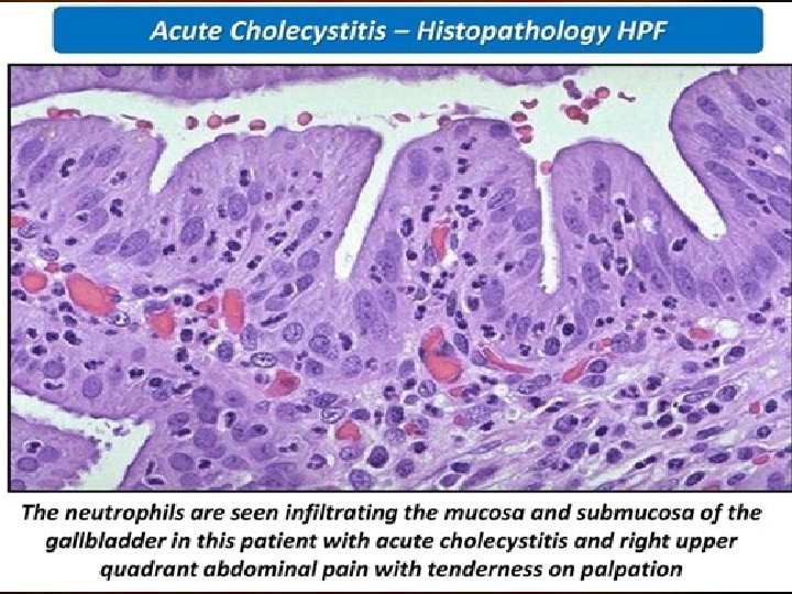 Cholecystitis v. Inflammation of gallbladder. v. Always occurs in association with gallstones. v. Acute, chronic, or acute superimposed on chronic. Morphology: Acute cholecystitis: v. Gallbladder: v. Enlarged, . v. Tense. v. Bright red or motteled violaceous color due to subserosal Hg.