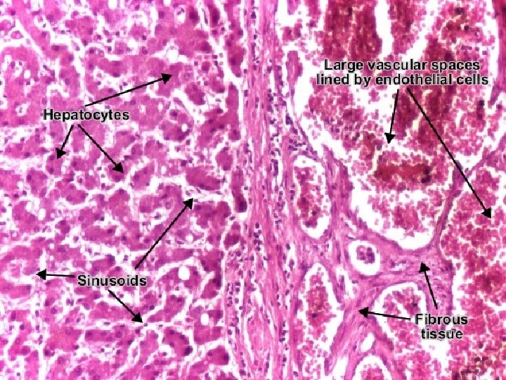 Histologic examination: v. Sheets & cords of cells. v. Resemble normal hepatocytes. v. Or have minimal variation in cell & nuclear size. v. Portal tracts are absent. (Loss of normal architecture). v. Prominent arterial vessels & draining veins.