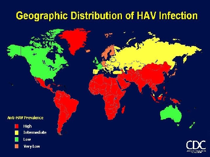 High Risk Groups for HAV Infection § People in household/sexual contact with infected persons § Medical and paramedical personnel in hospitals § International travellers from developed countries to regions of the world where HAV is endemic (3/1000 to 20/1000 people per month’s stay abroad) § Persons living in regions with endemic hepatitis A § Persons residing in areas where extended community outbreaks exist § Preschool children attending daycare centres, their parents and siblings § Day-care centre employees § Residents and staff of closed communities (institutions) § Refugees residing in temporary camps following catastrophes § Homosexually active men § Injecting drug users using unsterilized injection needles § Persons with clotting factor disorders § Persons with chronic liver disease § Food-service establishments/food handlers § Persons working with non-human primates