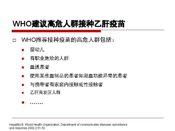 Hepatitis B vaccination indications o Other indications: n n n household contacts and sex partners of persons with chronic hepatitis B virus (HBV) infection; clients and staff members of institutions for the developmentally disabled; inmates of correctional facilities; international travelers who will be in countries with high or intermediate prevalence of chronic HBV infection for >6 months
