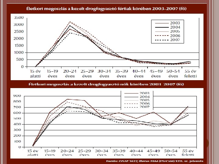 Droghasználat Magyarországon • • 14353 drogfogyasztót regisztráltak (2008) 12%-kal nőtt az új betegek száma 13%-al csökkent a heroin-fogyasztók száma. 25%-al nőtt a kannabisz-származékokat fogyasztók és az amfetamin-fogyasztók száma is. • kokain fogyasztás is 20%-al nőtt • A dizájner droghasználók száma jelentősen emelkedett • acut HBV fertőzés tendenciája változatlan, míg az acut HCV fertőzések száma az utóbbi években növekszik • 34 év feletti nők körében magas fertőzöttség: 51, 7 %-os • az új HCV fertőzöttek 18 -90%-a iv. droghasználó • 68%-ban közös tű, illetve fecskendő használat