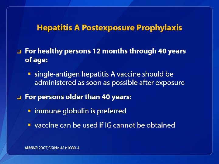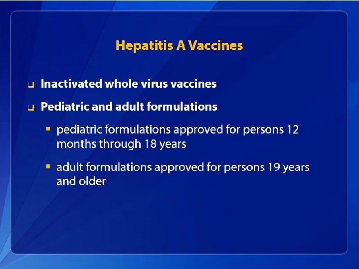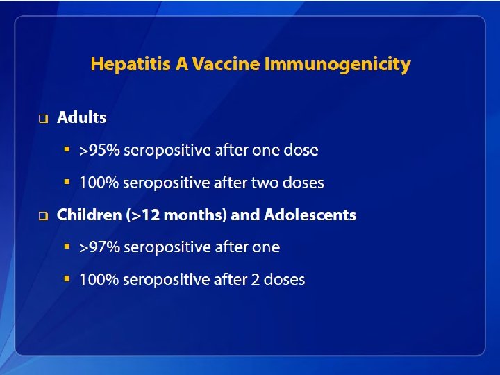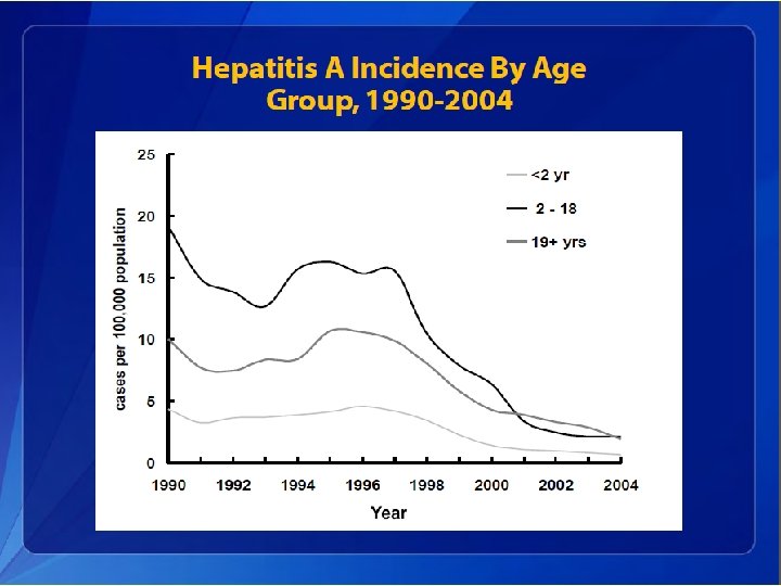 Hepatitis A Acute Illness • In children aged <6 years, 70% of infections are asymptomatic; if illness does occur, it is typically not accompanied by jaundice. • Among older children and adults, infection is typically symptomatic, with jaundice occurring in >70% of patients. • Symptoms usually last less than 2 months, although 10%– 15% of symptomatic persons have prolonged or relapsing disease for up to 6 months.
