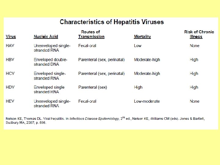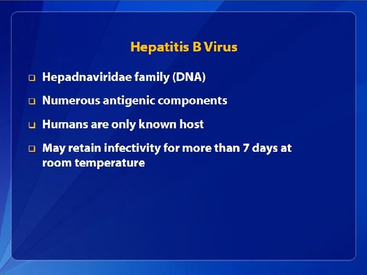 Hepatitis B Characteristics • A Hepadnaviridae – partially double-stranded DNA virus • HBs. Ag – stimulates protective antibodies, a marker for current infection • HBc. Ag – localized within liver cells, identifies acute infection, anti-HBc. Ag persists for life and is a marker of past infection • HBe. AG – a marker of active replication and infectivity