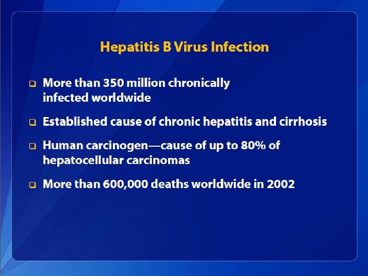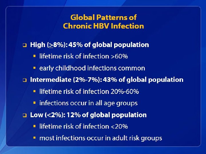 Hepatitis B Epidemiology • An estimated 800, 000– 1. 4 million persons in the United States have chronic HBV infection. • Chronic infection is an even greater problem globally, affecting approximately 350 million persons. • An estimated 620, 000 persons worldwide die from HBV-related liver disease each year.